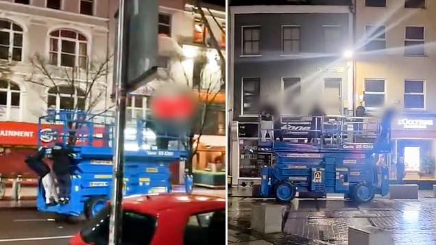 Bedlam unfolded at well-below breackneck speeds in Cork,Ireland,last night when four apparently drunken men took a scissor lift for a joyride.